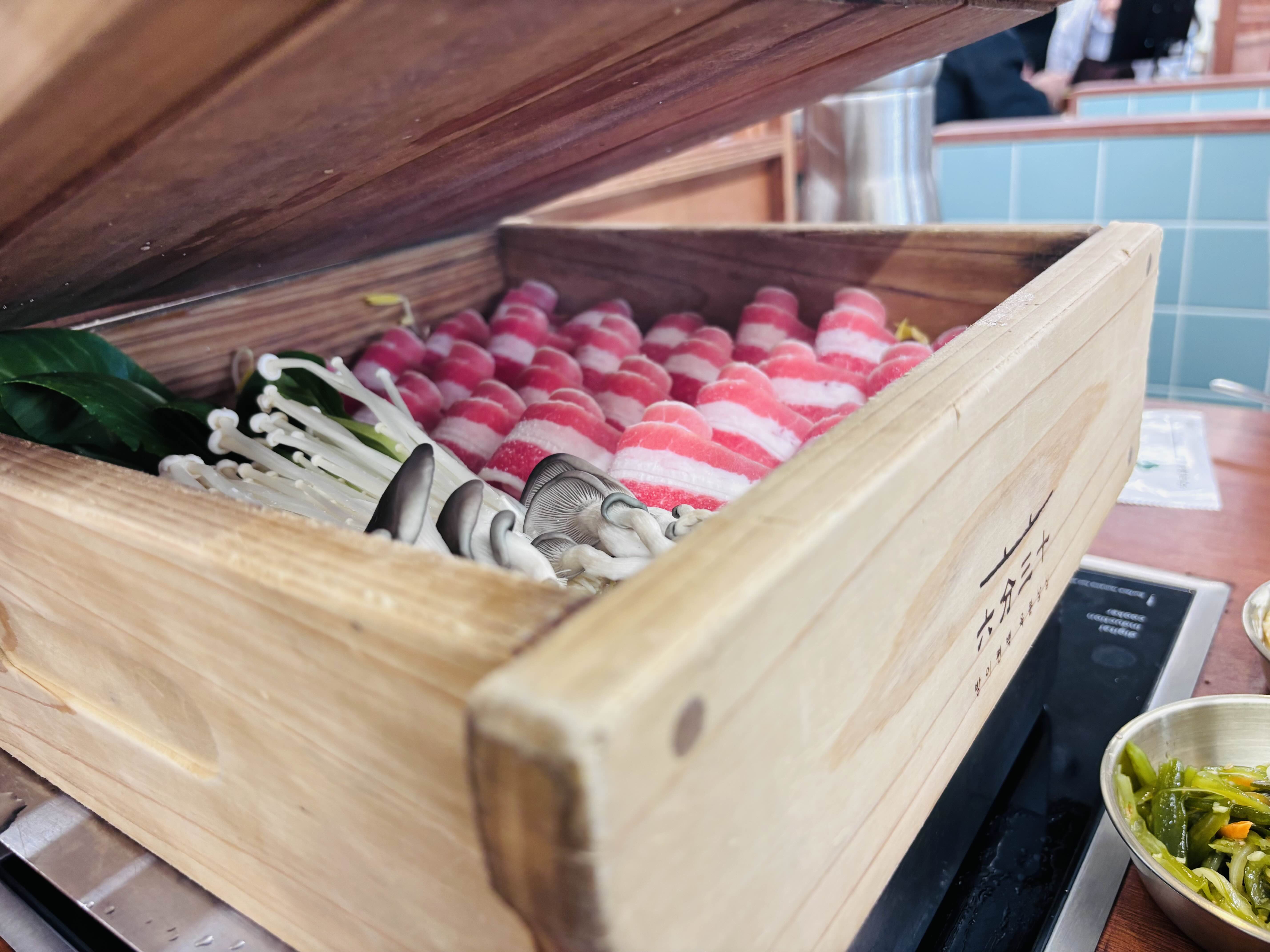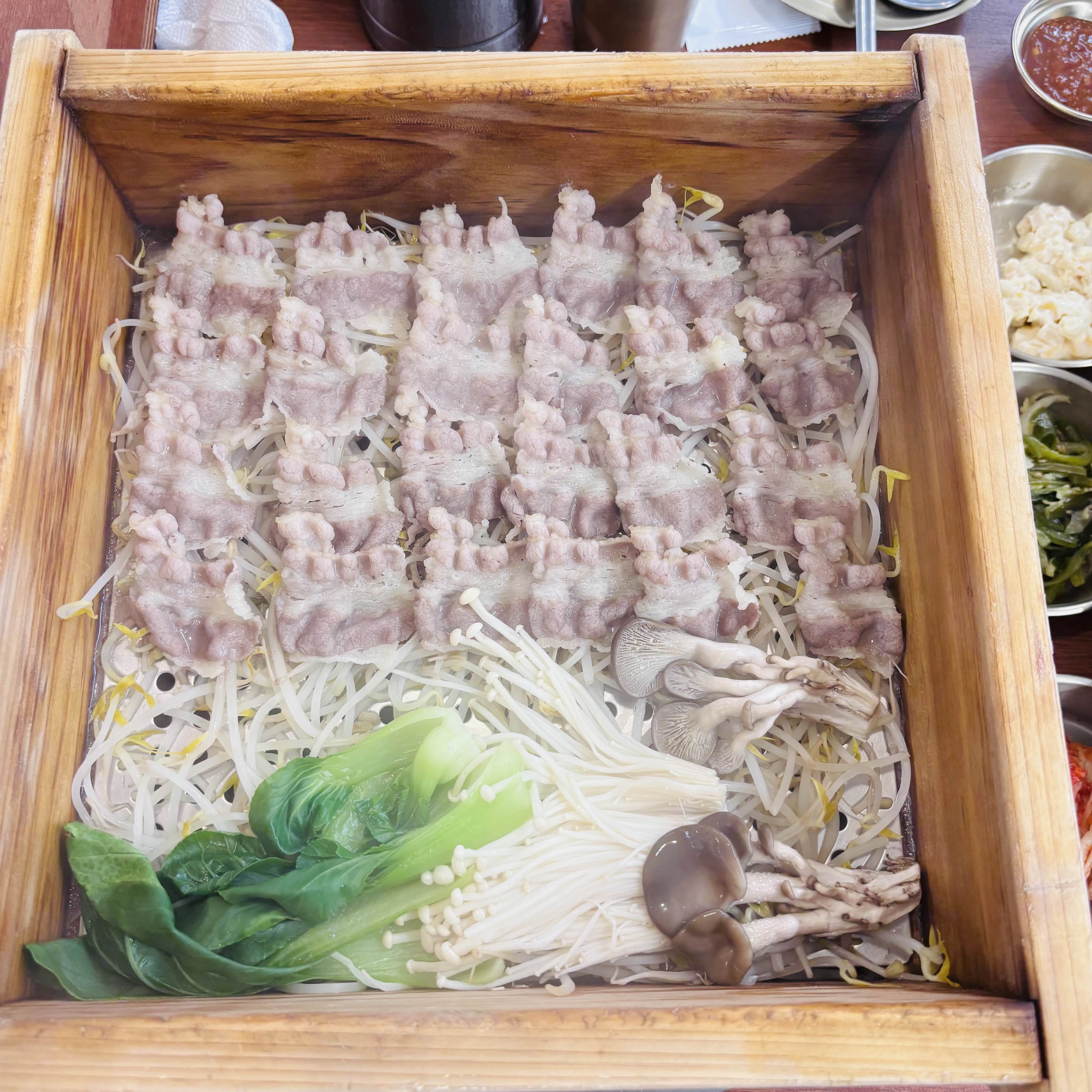 바닥에 숙주 깔려있고 그위에 고기 올라가 있었음