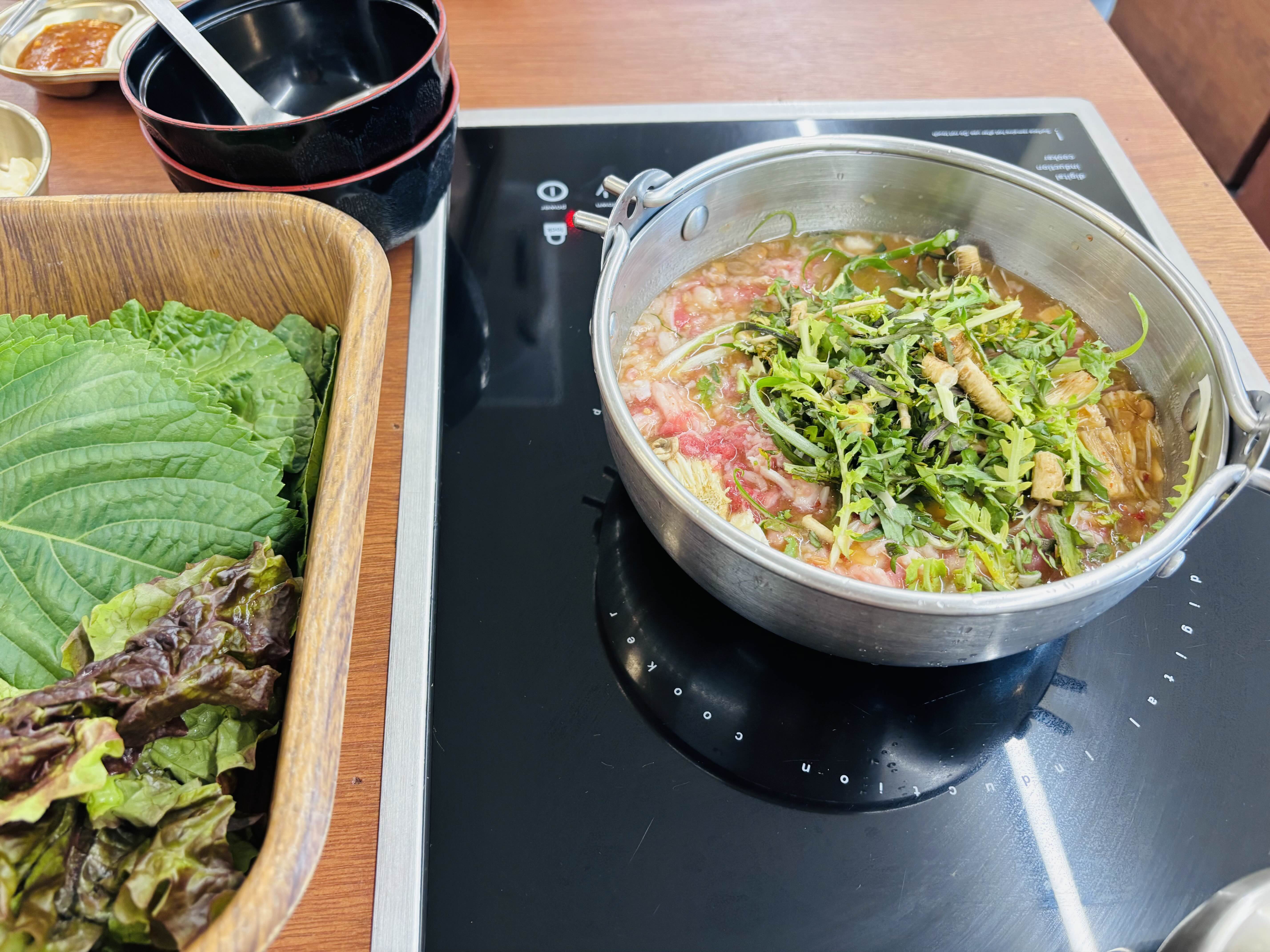된장찌개에 봄나물(냉이로 추정)이랑 고기 들어있다.