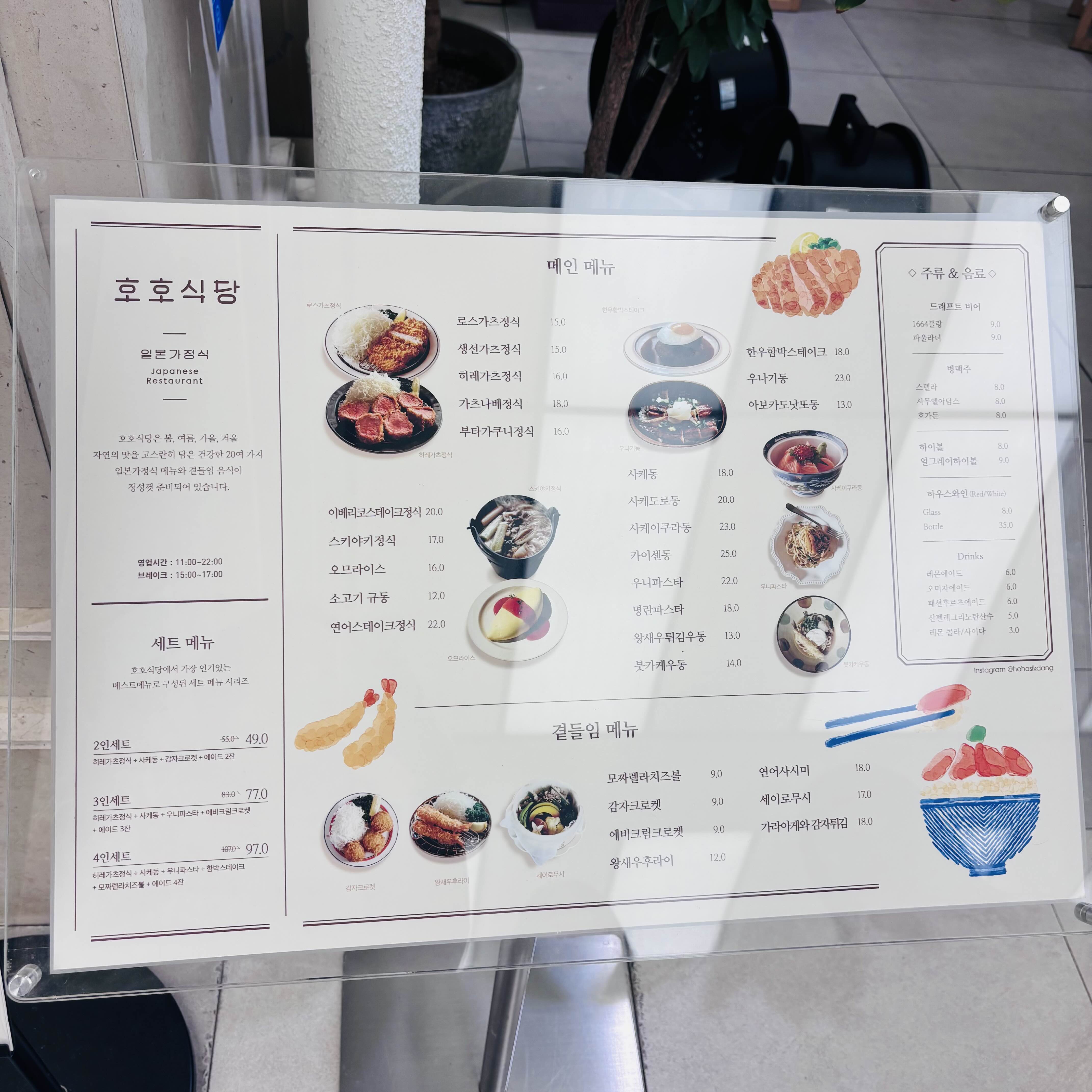 일본가정식을 파는 호호식당 메뉴판. 돈카츠, 우나기동, 오므라이스 등이 눈에 띔