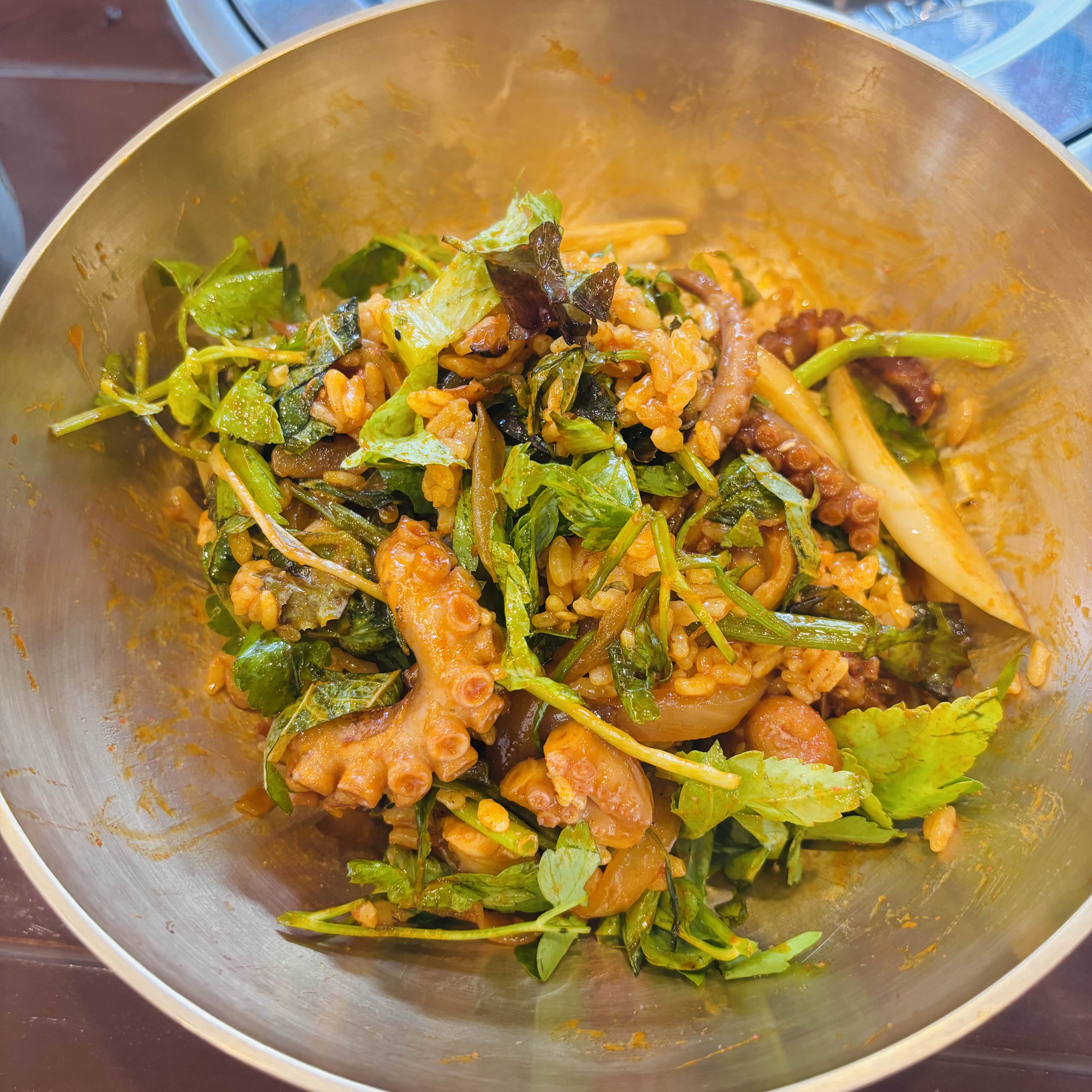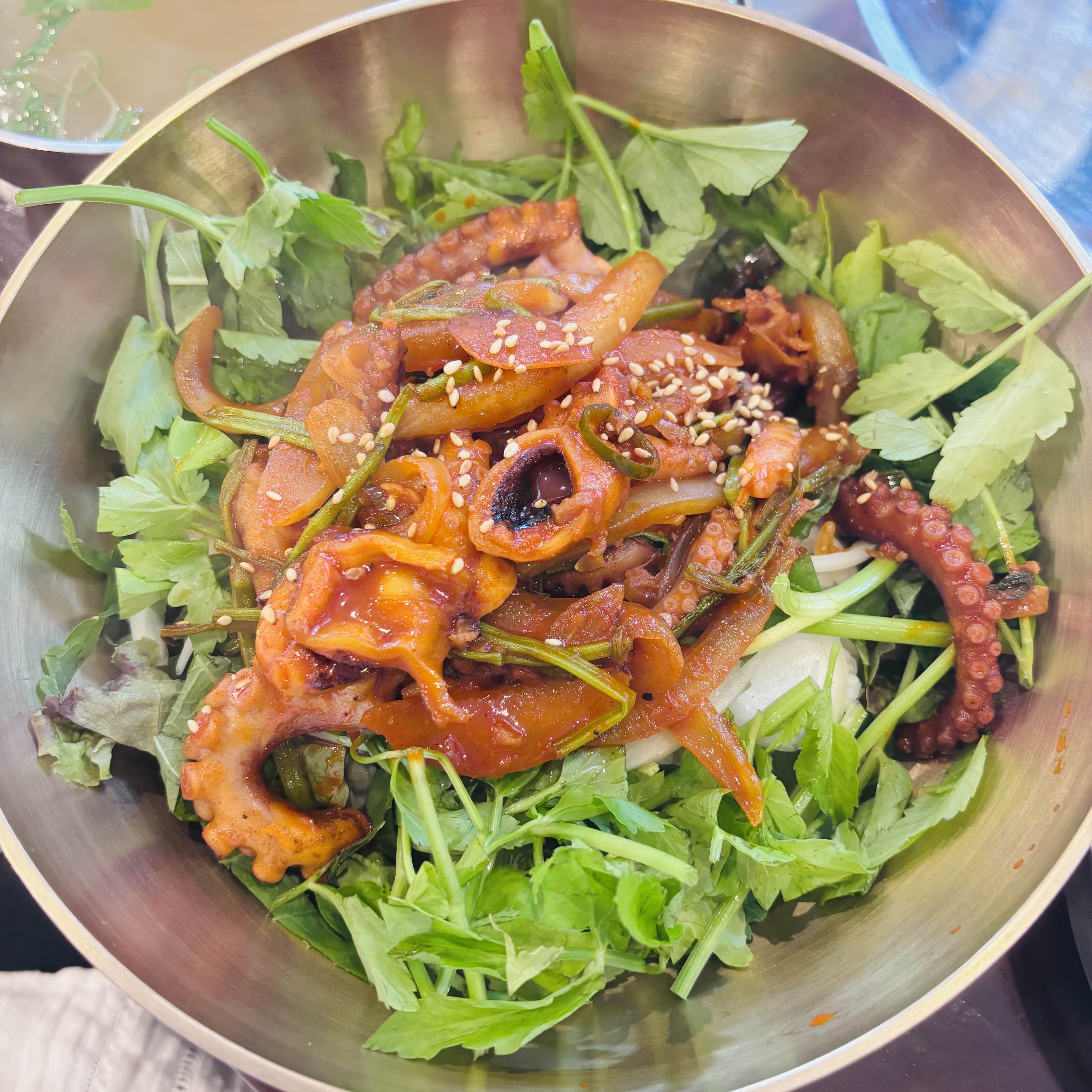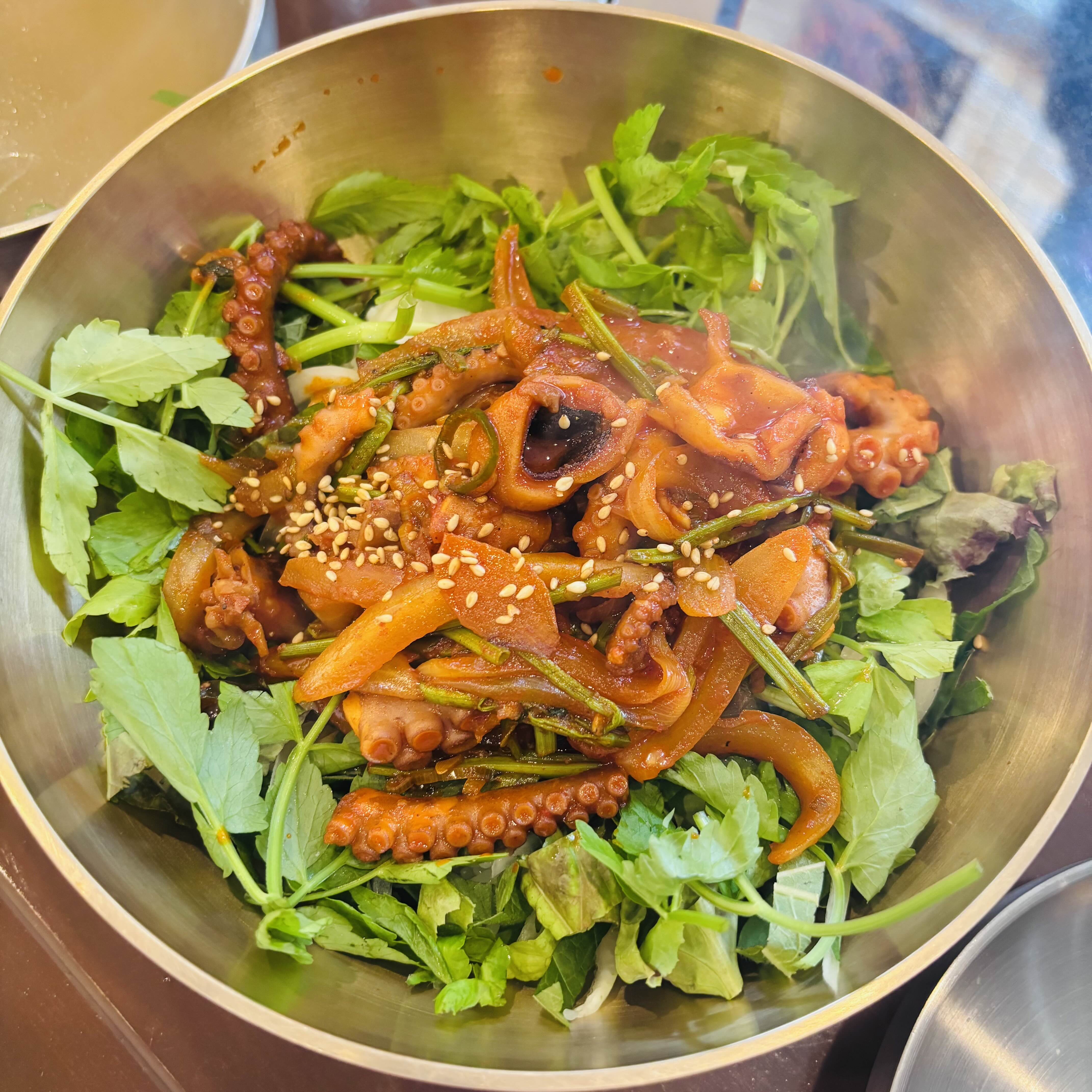 새콤한 미나리양념 덕분에 느끼하지 않음