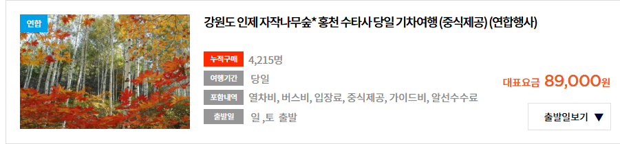 평소에 가보고 싶던 인제 자작나무숲. 버스 타고 이동하는 상품보다 가격대가 높지만 기차가 일정대로 딱딱 움직이기 용이할 듯하여 기차여행 상품 찾던 차에, 코리아레일투어(구 코레일투어)에서 ITX를 이용한 당일 여행 상품 발견! 삼주 전쯤 출발 확정 단계에서 예약했는데 이후에 마감되었다.