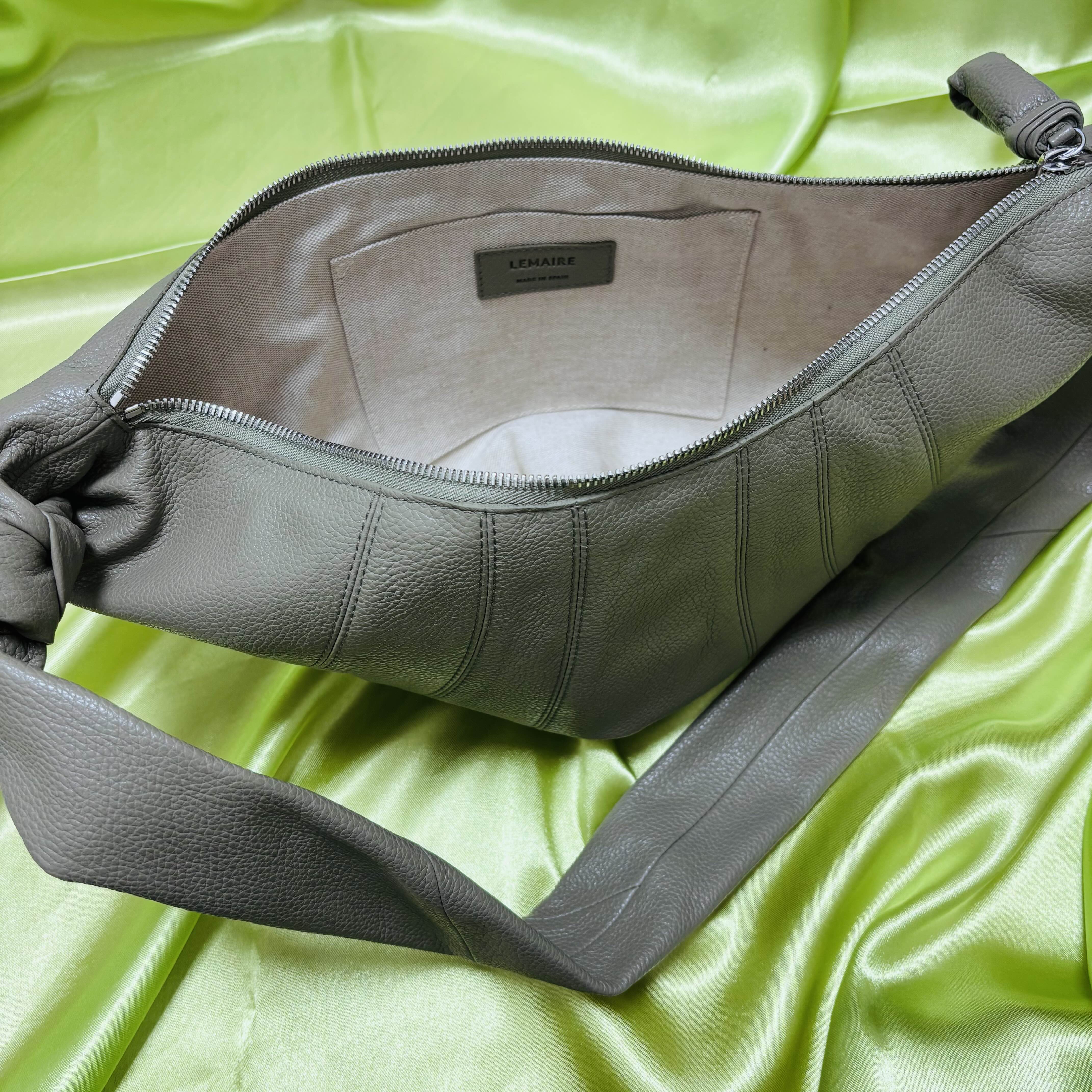 르메르(Lemaire)의 Croissant 백을 만나보세요. 이 미디엄 사이즈 백은 부드러운 그린 컬러의 가죽으로 제작되었으며, 이름처럼 크루아상 모양을 연상시키는 섬세한 스티칭이 특징입니다. 감각적인 매듭 디테일의 숄더 스트랩이 돋보입니다.